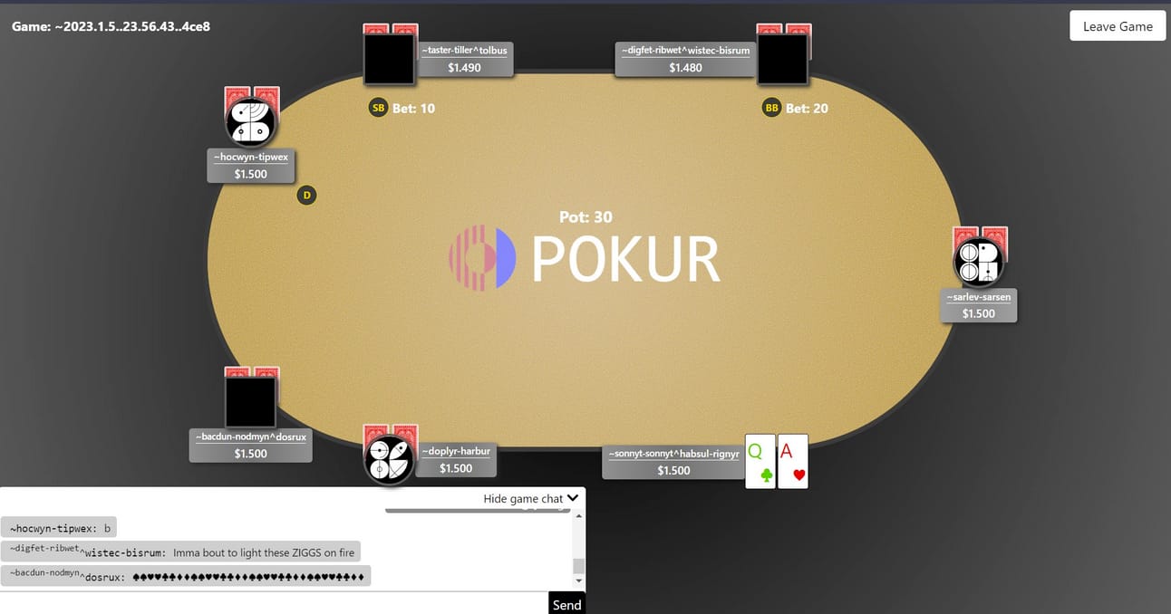 People are playing poker with money on Urbit. It’s testnet money, but nonetheless!