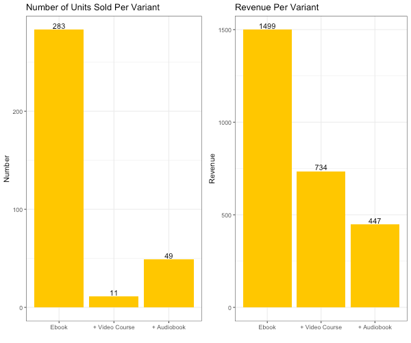 We can break down the number of sales for each variant of the product. As you see below, I only sold 11 courses but this generated more revenue than the 49 audiobooks.